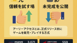 レースシム界で広がる「アーリーアクセス(早期アクセス)」の現実を徹底考察。開発とプレイヤーの信頼関係、成功例・失敗例(Le Mans Ultimate/Assetto Corsa Evo)をデータとともに検証。2025〜26年の新作シム動向マップも掲載。