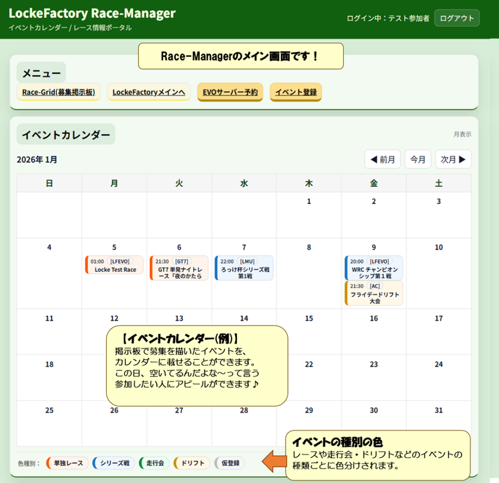 - ゲームタイトルの別、レース形式か走行会か、「いつ、何があるか」が一目で分かる