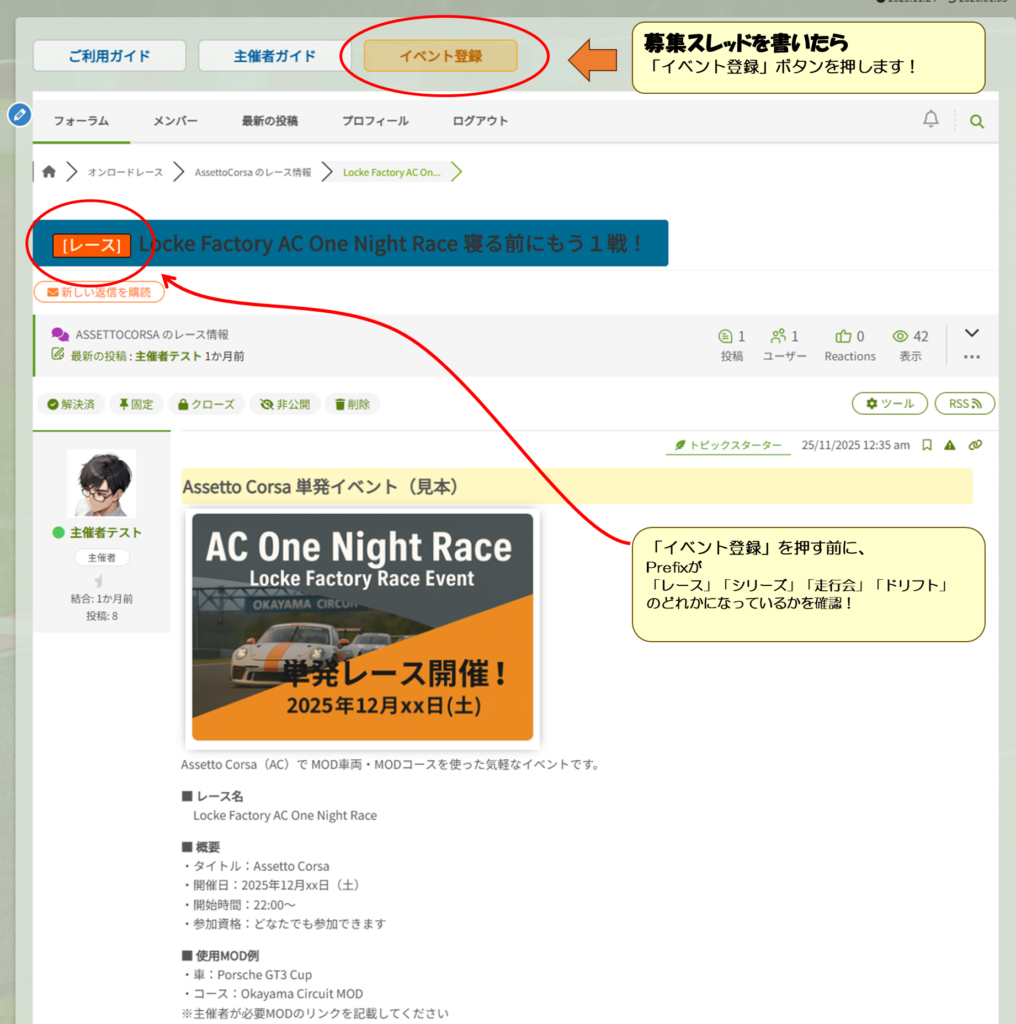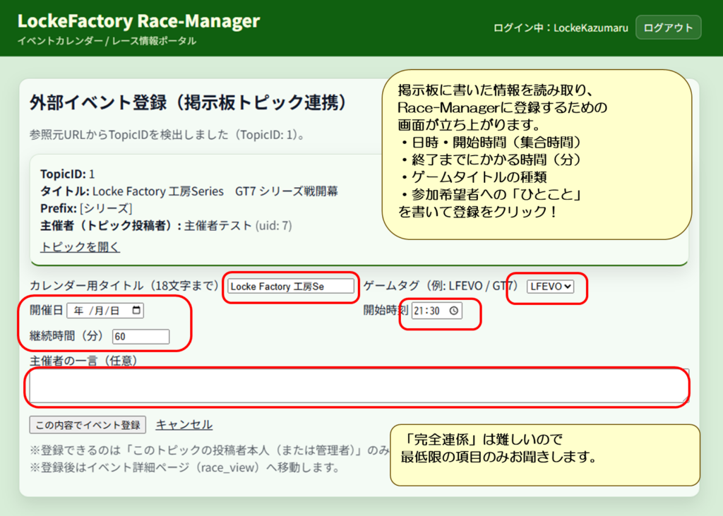 - Race-Manager にイベントを登録 (★スレッドを建ててからボタン1つで連携できます。)
