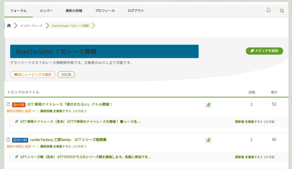 上の例ではGT7のフォーラムです。「トピックを追加」をクリックすると、新しいスレッドを作成することができます。