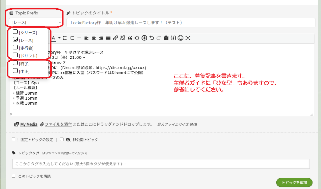 スレッド作成時には、トピック種別(Prefix) を必ず選択してください。